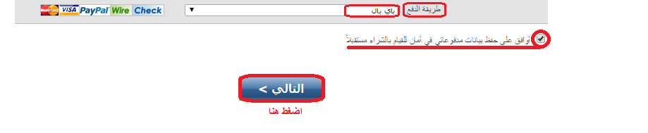 سيتم تحويلك إلى صفحة جديدة، أسفل الصفحة اختر "باي بال" من القائمة المنسدلة كطريقة دفع. تأكد من اختيار "أوافق على حفظ بيانات مدفوعاتي في أمان للقيام بالشراء مستقبلاً"، وذلك بوضع علامة (√) في الصندوق المخصص لذلك ثم اضغط على زر "التالي".
