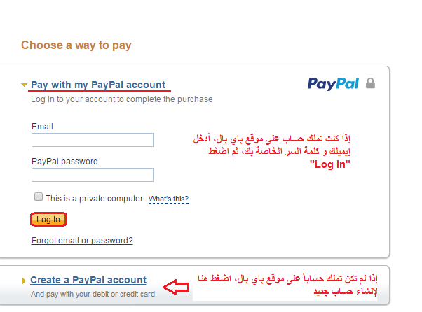 إذا كنت تملك حساب على موقع باي بال، أدخل البريد الإلكتروني وكلمة المرور للدخول على صفحة حسابك وإتمام عملية الشراء.