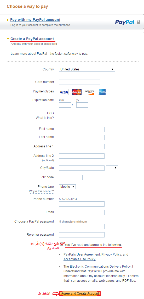 إذا لم تكن تملك حساباً على موقع باي بال، اضغط على “Create a PayPal account”، املأ البيانات المطلوبة، ثم اضغط على “Agree and Create Account”.