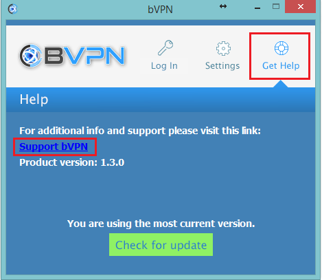 Eğer yardıma ihtiyacınız varsa, "Yardım Al" [Get Help] seçeneğine tıklayın ve ardından "b.VPN destek" [Support b.VPN] linki ile devam edin.