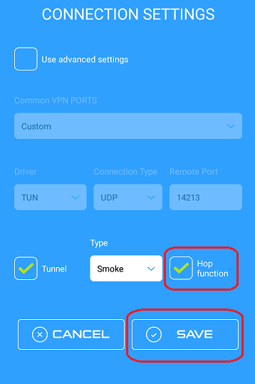 Ve çalışmadığı için "Dişli" düğmesini tıklayın ve "Hop Fonksiyonu" nu işaretleyin. Ana pencereye geri dönmek için "Kaydet" düğmesine, ardından b.VPN logosuna hafifçe dokunun ve "Bağlan" düğmesine dokunun.